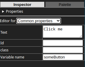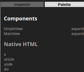 The palette is list of elements that can be dragged and dropped to the outline or to the canvas. Components found in the project via scanning are also present in the palette. There are two ways to add these to the component: by dragging the name of the element to insert it as an element, or by dragging the "expand" next to the element tag to expand the contents of the component into the current one.