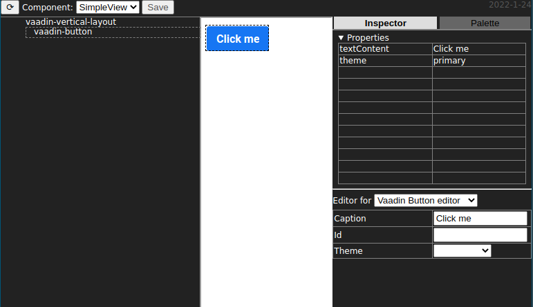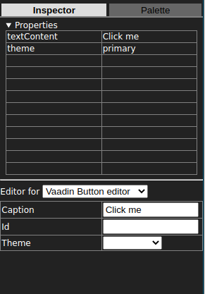 The inpector is for modifying the properties of the selected component (these are attributes in the case of Vaadin). There are two ways to edit them: you can use a table of key value pairs, or custom editors that target specific elements and property sets. For example, Vaadin Button has its own editor and flexbox properties have their own editor that can be used with any element. An empty key and value in the table is considered to be non-existent, so to delete an attribute, clear out the row.